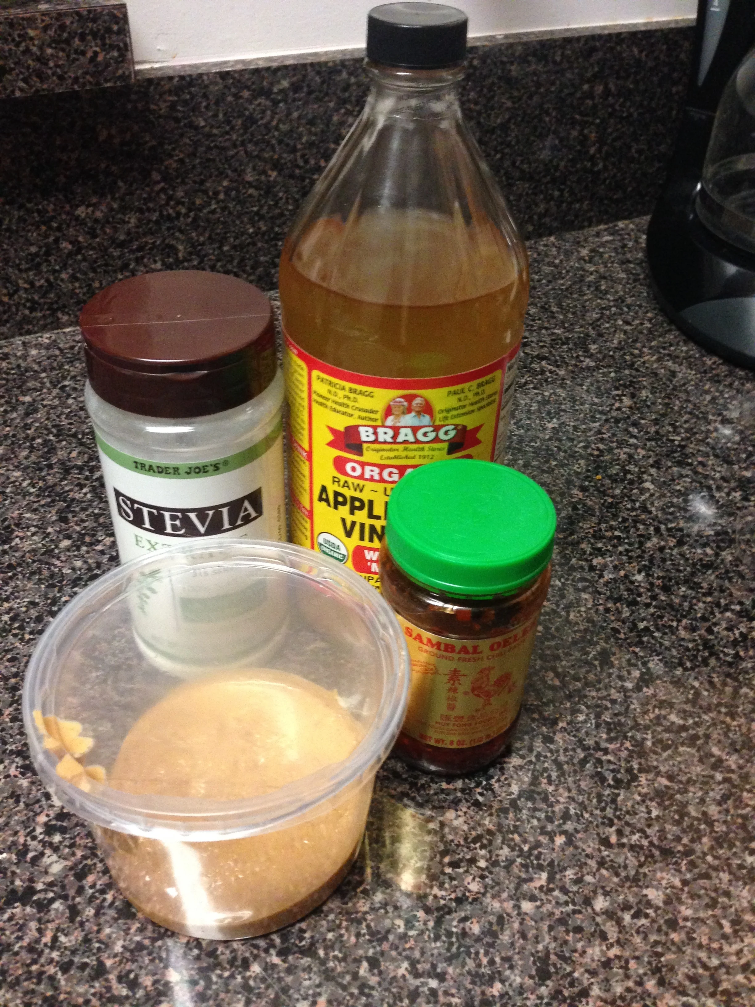 In a medium-sized bowl whisk together water, apple cider vinegar, peanut putter, chili paste and stevia until well combined.