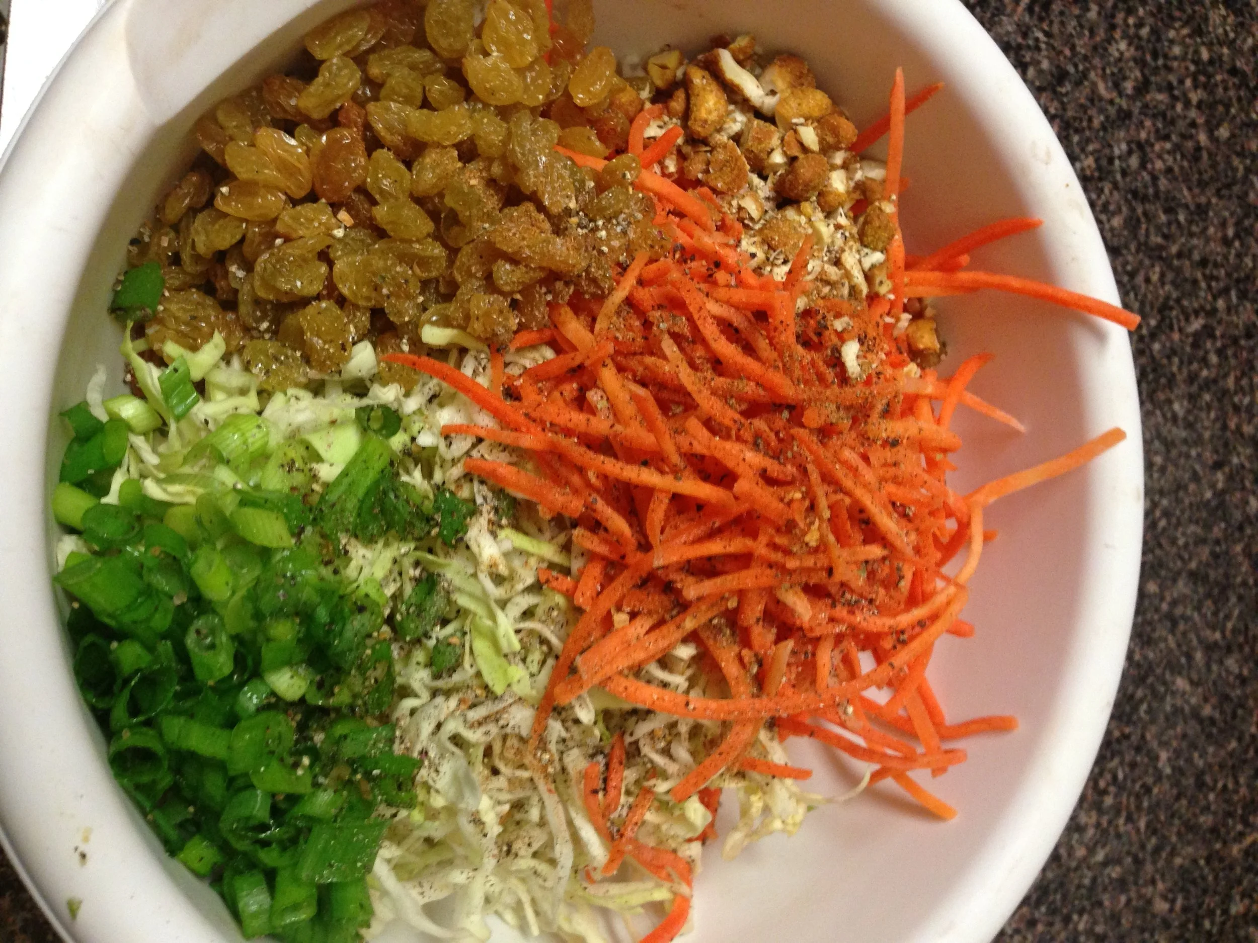In a large bowl, combine cabbage, carrots, raisins, cashews, and green onions.